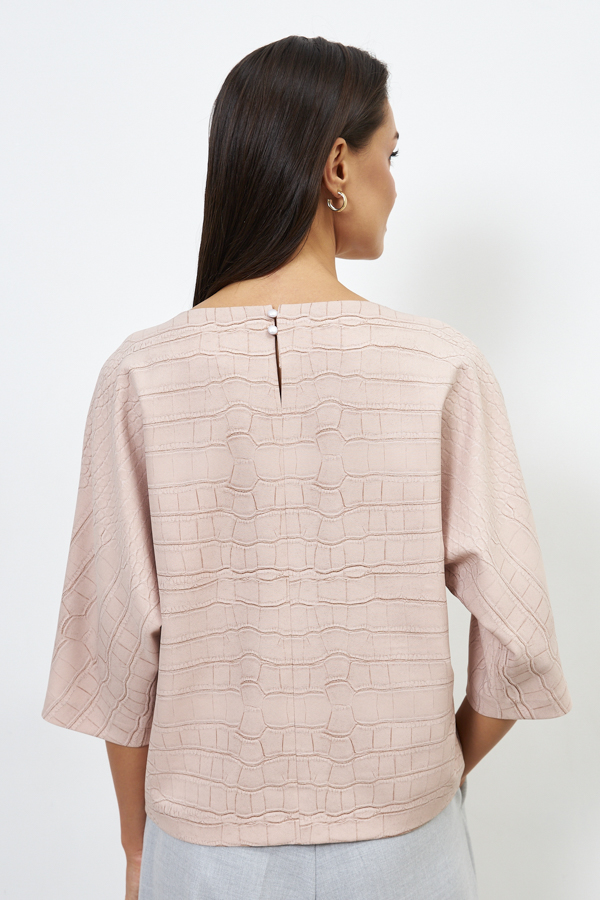 Блуза из плательной ткани свободного силуэта. Вырез горловины «лодочка», сзади застёжка на петли-пуговицы. Цельнокроеный длинный рукав-летучая мышь.