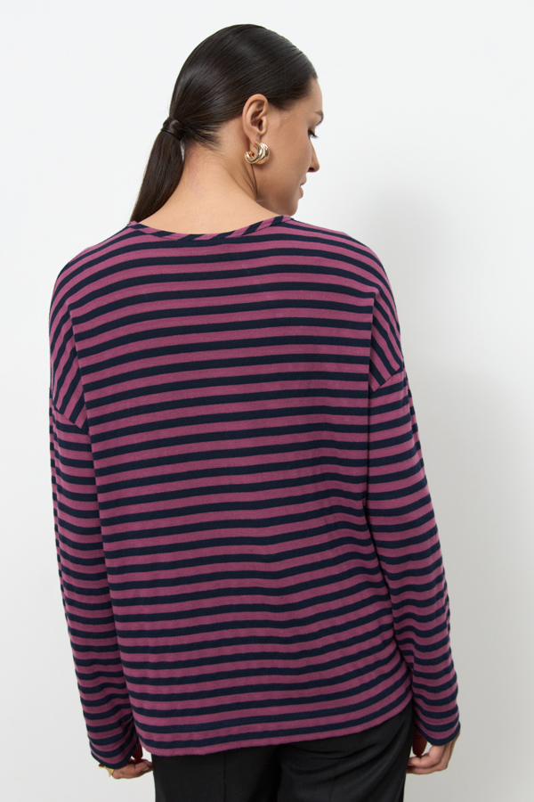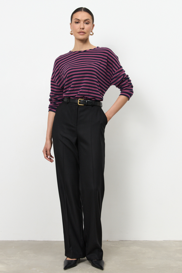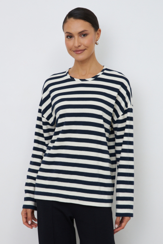 Джемпер из эластичного полотна. Свободный силуэт со спущенной линией плеча и длинным рукавом. Круглый вырез горловины окантован эластичной бейкой. В таблице размеров представлены параметры человека, а не изделия.