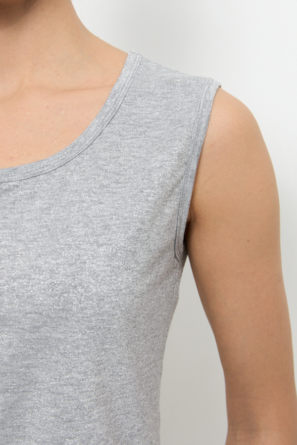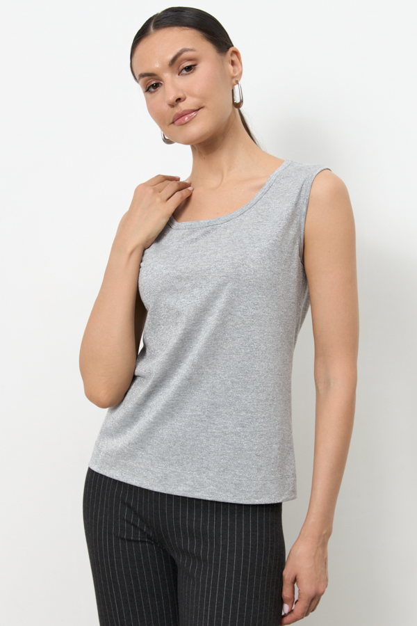 Топ из эластичного полотна с люрексом. Изделие полуприлегающего силуэта. Линия горловины и линия проймы окантованы эластичной бейкой.