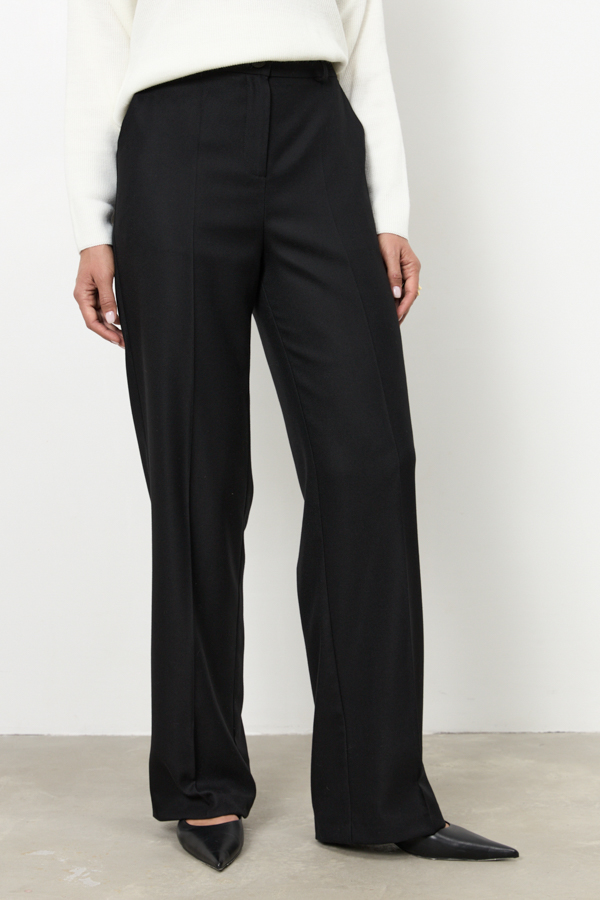 Брюки из костюмной ткани прямого силуэта. На передней половинке изделия выполнены карманы с подкройным бочком, на задней - талиевые вытачки и имитация карманов в рамку. Притачной пояс со шлёвками. Застёжка на молнию-гульфик и пуговицу. Такой крой выгодно подчеркнёт длину ваших ног.