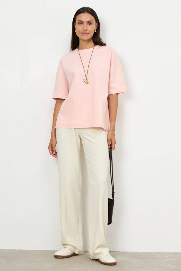 Джемпер из эластичного полотна. Свободный силуэт со спущенной линией плеча и рукавом до локтя. Вырез горловины оформлен бейкой. В таблице размеров представлены параметры человека, а не изделия.