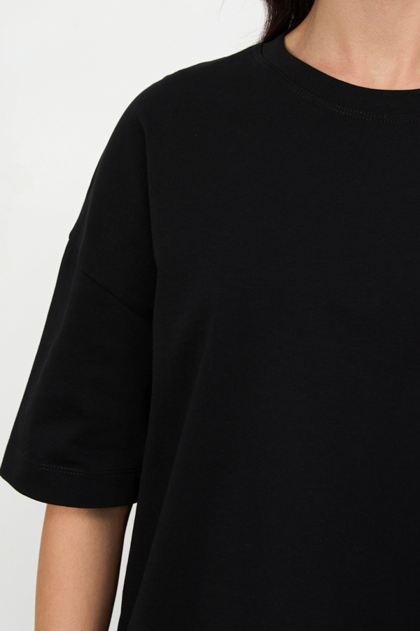 Джемпер из эластичного полотна. Свободный силуэт со спущенной линией плеча и рукавом до локтя. Вырез горловины оформлен бейкой. В таблице размеров представлены параметры человека, а не изделия.
