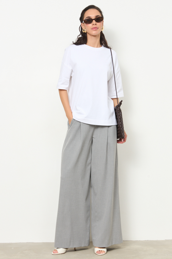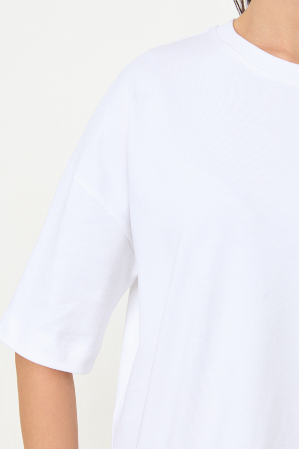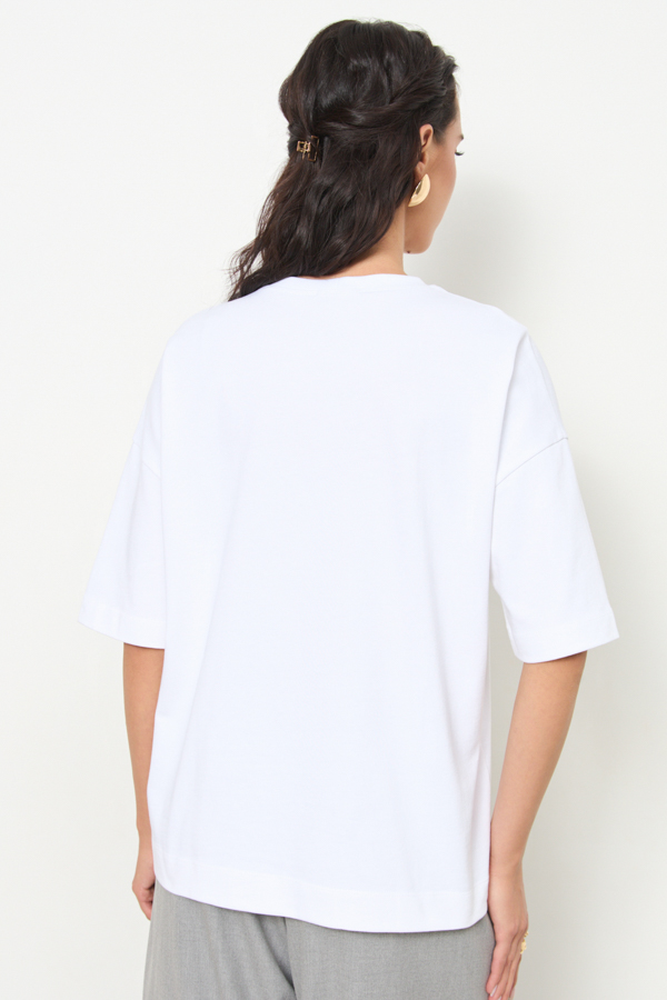 Джемпер из эластичного полотна. Свободный силуэт со спущенной линией плеча и рукавом до локтя. Вырез горловины оформлен бейкой. В таблице размеров представлены параметры человека, а не изделия.