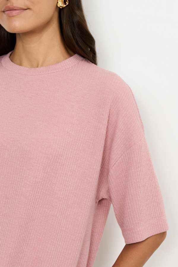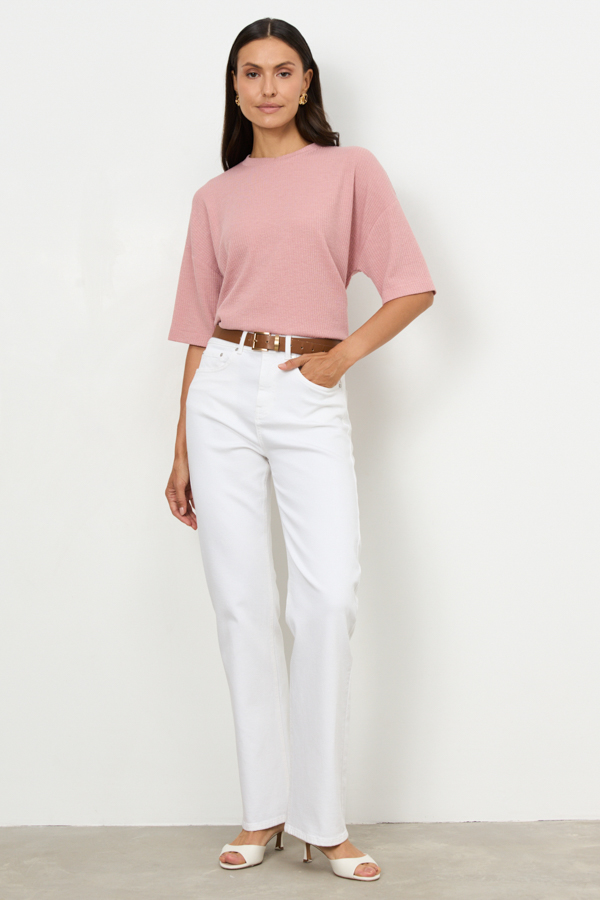 Джемпер из фактурного эластичного полотна. Свободный силуэт со спущенной линией плеча и коротким рукавом. Вырез горловины оформлен бейкой. В таблице размеров представлены параметры человека, а не изделия.