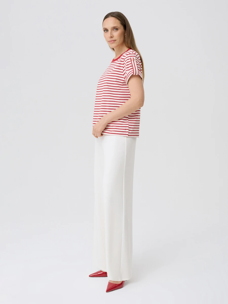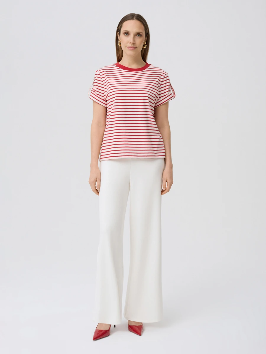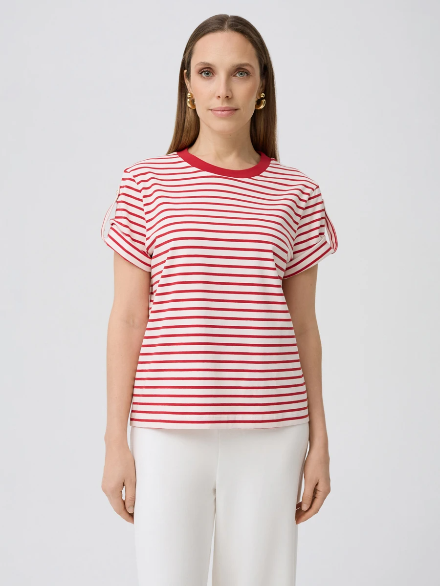 Женская футболка в полоску — универсальный и стильный элемент гардероба, который станет основой для множества повседневных образов. Контрастное сочетание белого фона и красных горизонтальных полос создает динамичный и свежий акцент, а аккуратный круглый вырез с красной окантовкой придает модели завершенный вид. Короткие рукава с декоративной планкой и пуговицами добавляют изюминку и делают фасон более интересным, сохраняя при этом комфорт и лаконичность.