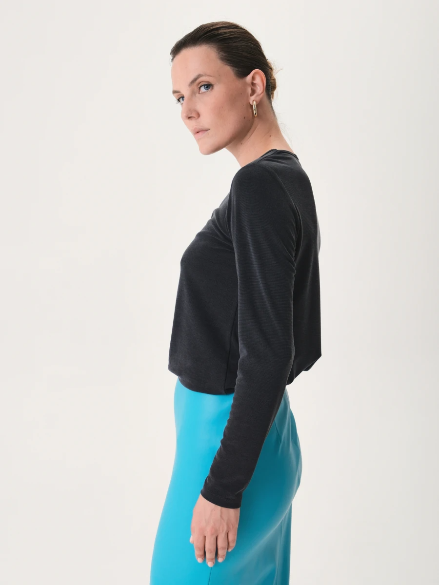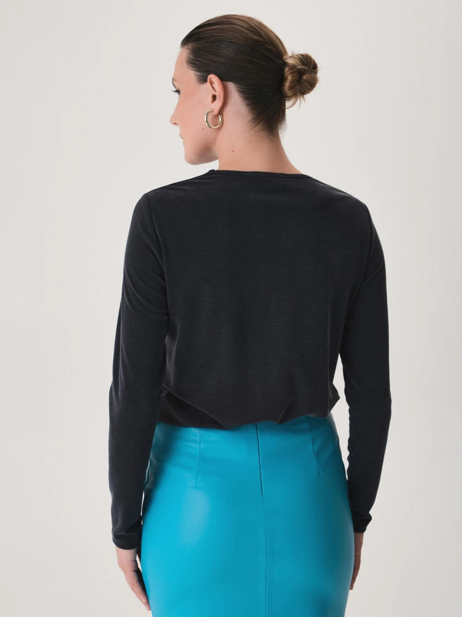 Женственный однотонный лонгслив в актуальном темно-сером оттенке. Модель выполнена из мягкой трикотажной ткани. Благодаря премиальному качеству материалов в составе она приятно ложится к телу, не теряет насыщенность цвета при стирке и комфортно носится на протяжении всего дня. Полуприлегающий крой отлично садится на любой тип фигуры и деликатно скрывает недостатки. Можно стилизовать лонгслив с брюками и джинсами на высокой посадке или элегантными юбками.