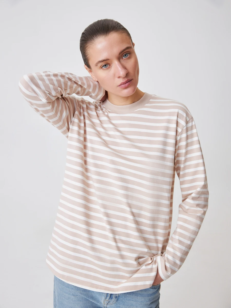 Oversize лонгслив прямого кроя - стильное и практичное решение повседневного гардероба. Модель белого цвета в горизонтальную бежевую полоску имеет длинные свободные рукава и круглую горловину. По бокам имеется аккуратный аккуратный акцент в виде небольших разрезов. Стандартная длина позволяет заправлять изделие в брюки и джинсы или носить навыпуск. Это дает возможность разнообразить образы без лишних усилий.