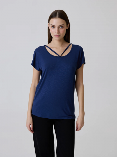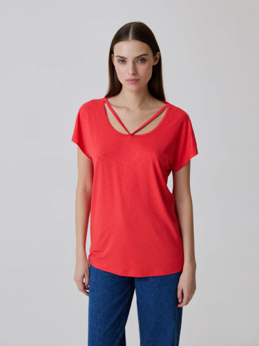 Свободная трикотажная футболка в ярком коралловом оттенке сделает даже самый простой повседневный лук более сочным и запоминающимся. Прямой крой со спадающими с плеч рукавами в сочетании с легкой тканью создают мягкий плавный силуэт. Глубокий овальный вырез открывает ключицы и спину. Главная особенность модели - тонкие декоративные ленты на горловине и спине. С их помощью создается интересный акцент и образ обретает более романтический характер.