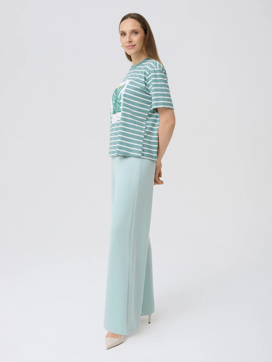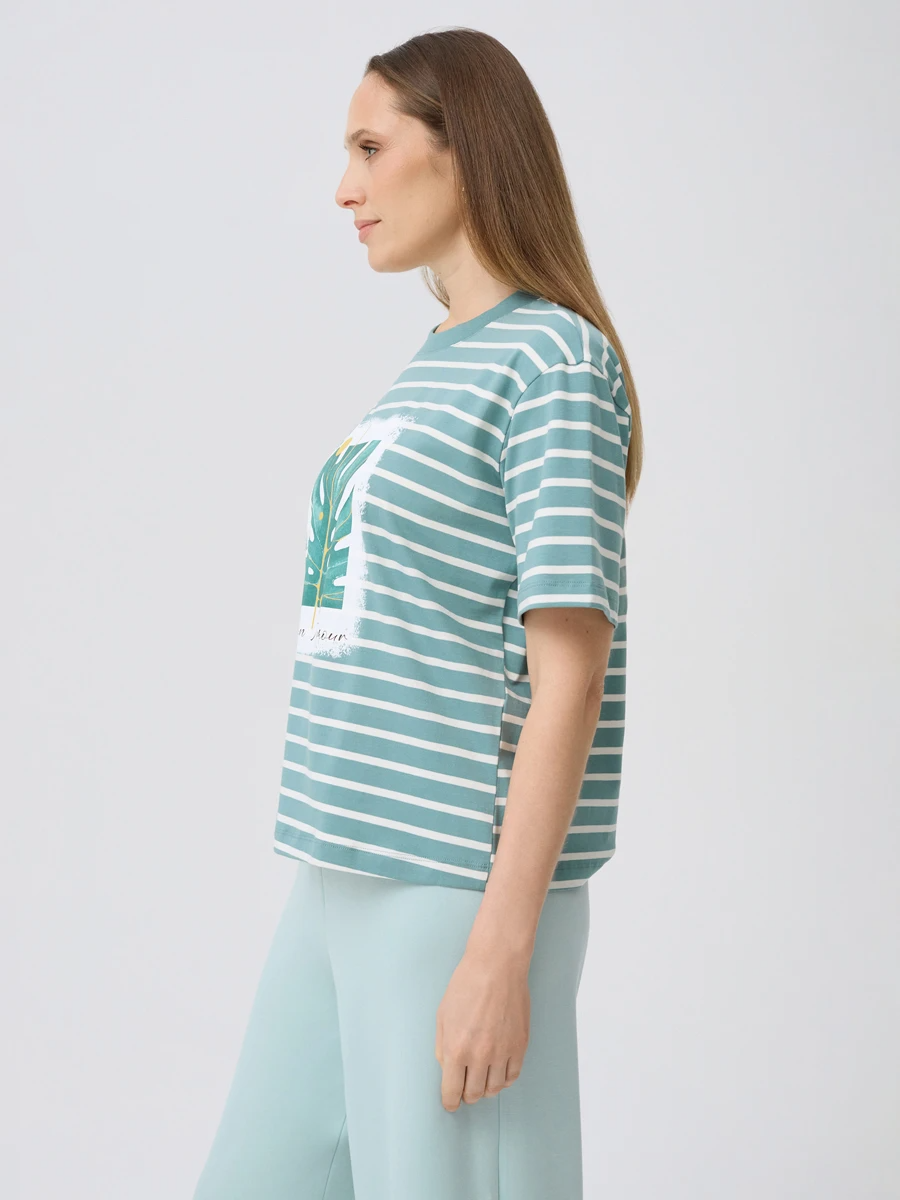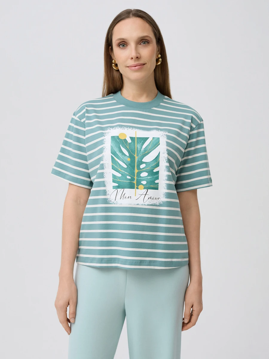 Женская футболка свободного кроя выполнена из мягкого трикотажа с высоким содержанием хлопка и добавлением эластана. Горизонтальная бирюзово-белая полоска придает образу легкость и свежесть, а контрастный принт с изображением тропического листа и надписью «Mon Amour» создает игривое и расслабленное настроение. Классический круглый вырез и короткие рукава обеспечивают комфорт и свободу движений.