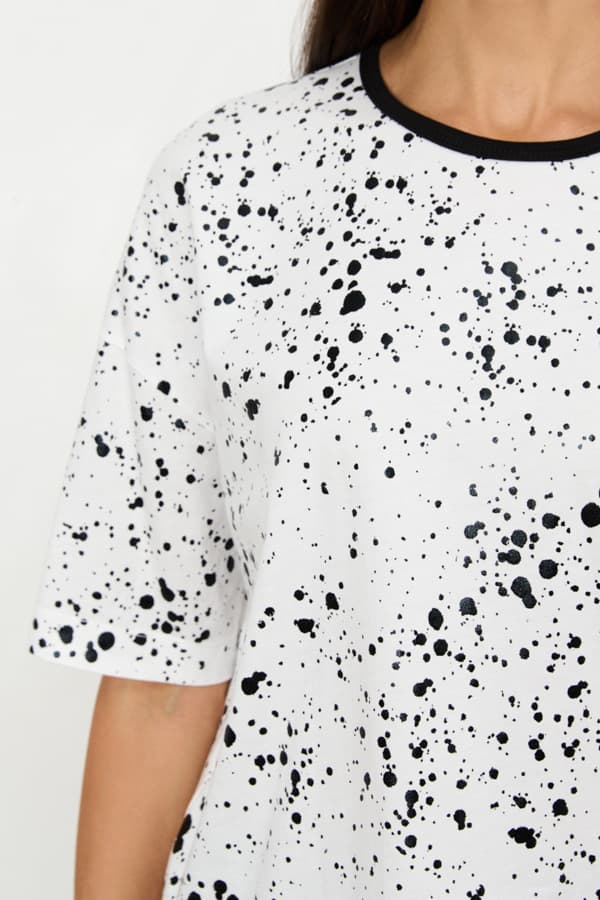 Джемпер из эластичного полотна. Свободный силуэт со спущенной линией плеча и коротким рукавом. Вырез горловины окантован эластичной бейкой. В таблице размеров представлены параметры человека, а не изделия.