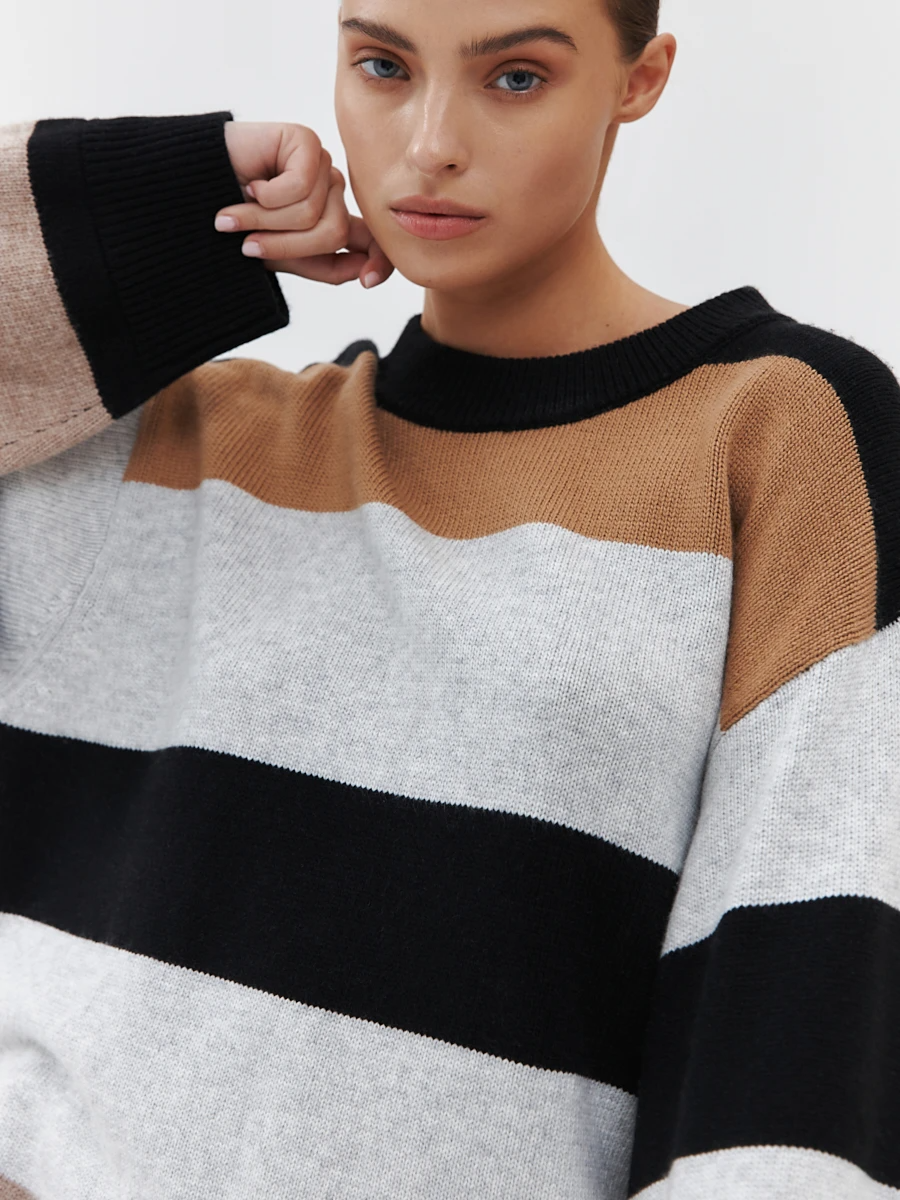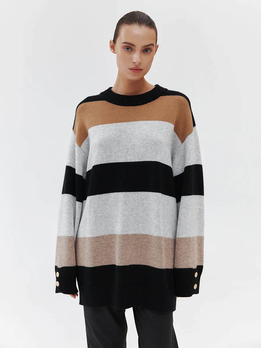 Теплый oversize джемпер в широкую горизонтальную полоску. Модель имеет круглый вырез и длинные объемные рукава. Широкие манжеты заужены к низу и украшены крупными золотыми пуговицами с фактурным рисунком. Гармоничное сочетание четырех цветов делает джемпер универсальной и практичной единицей, поскольку дает возможность стилизовать его с большим количеством разных вариантов одежды и обуви.