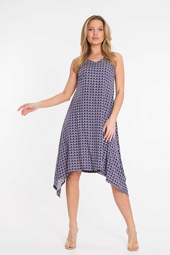 Платье из штапеля с набивным рисунком. Вырез горловины V-образный, низ платья разноуровневый - боковые стороны длиннее.