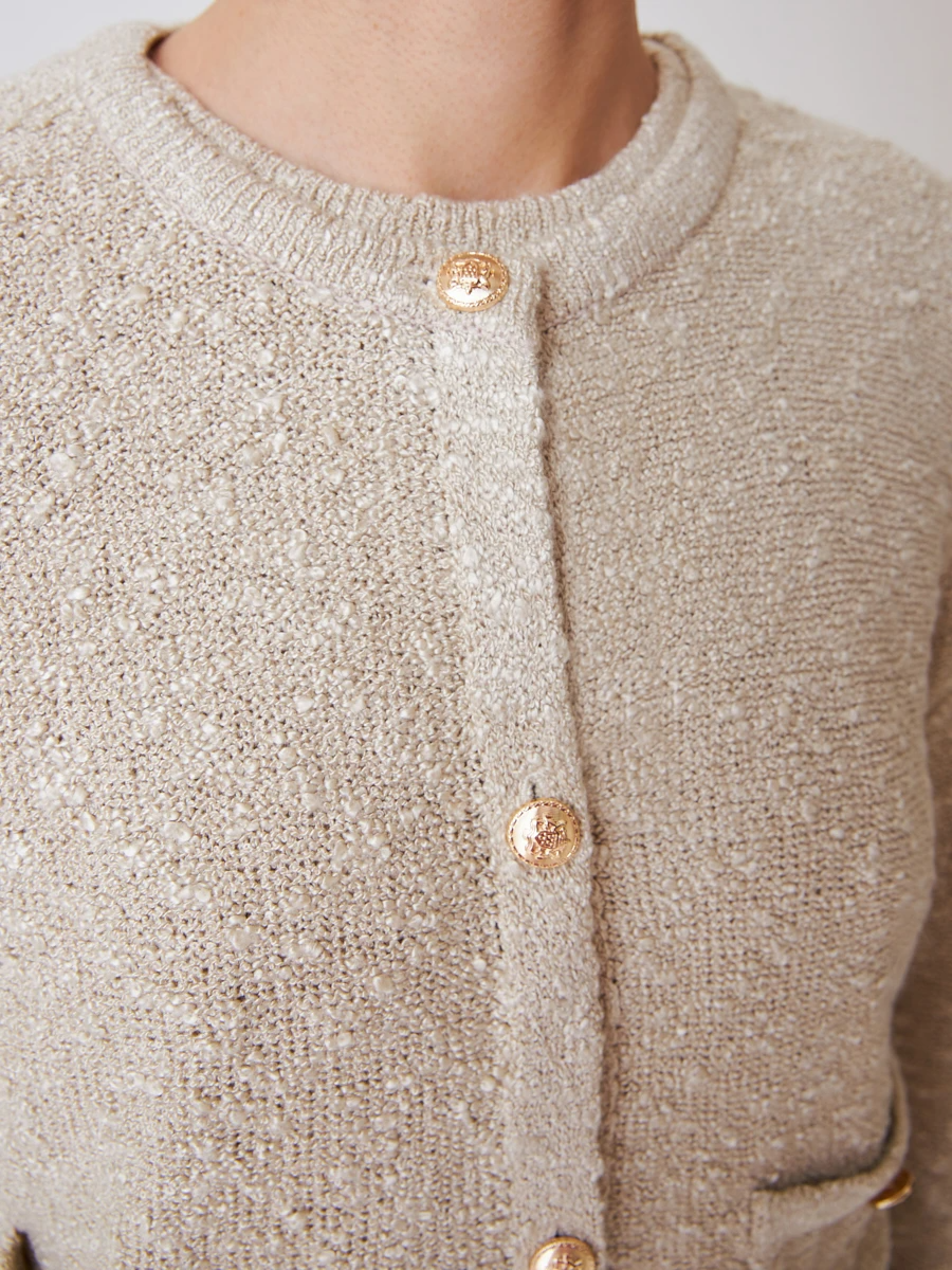 Укороченный кардиган в нежном бежевом оттенке. Мягкая фактурная ткань создает приятные тактильные ощущения и делает изделие более нарядным. Модель оснащена функциональными передними карманами с круглыми золотыми пуговицами. Застегивается кардиган на ряд из таких же пуговиц по всей длине. Минималистичный дизайн и универсальный цвет открывают горизонты для большого количества стильных сочетаний. Можно собрать свежий повседневный образ с синими джинсами на высокой посадке или же надеть юбку-карандаш для романтического вечера.