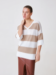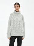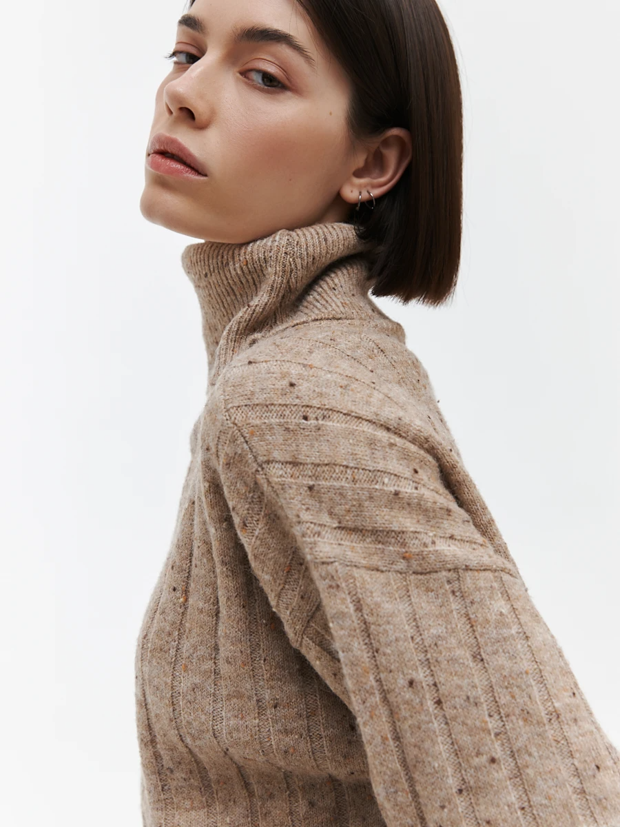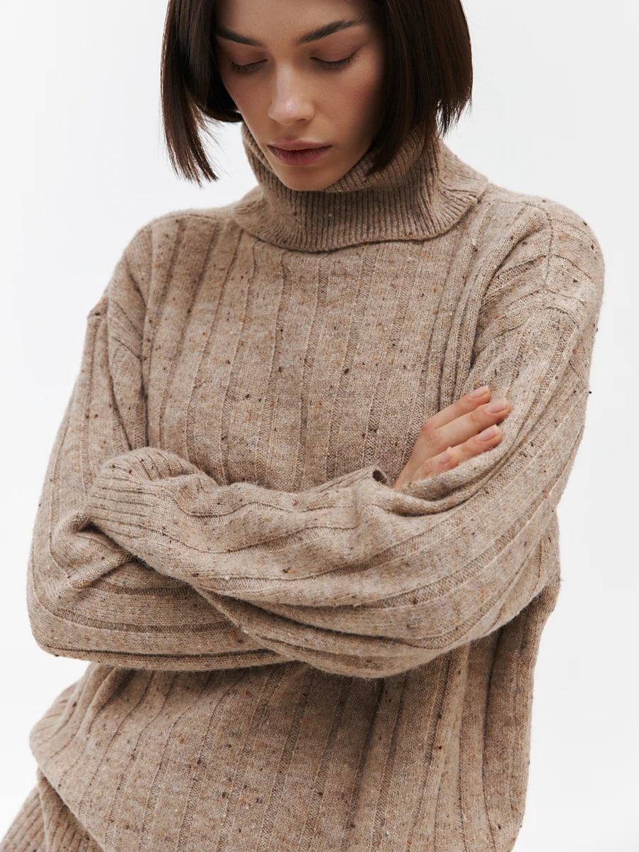 Женский свитер свободного кроя в бежевом цвете — идеальный выбор для холодного сезона. Модель выполнена из мягкой трикотажной пряжи с меланжевым эффектом и украшена вертикальным рельефным узором, который визуально вытягивает силуэт. Высокий воротник-гольф защитит от холода и добавит образу уюта, а приспущенная линия плеча и прямой крой создают расслабленное и современное настроение.