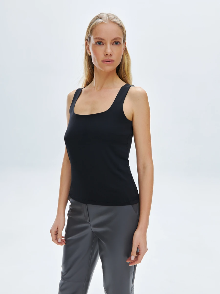 Топ в черном цвете с вырезом «каре». Универсальная базовая вещь, которую можно без труда вписать в повседневный и деловой гардероб. Модель выполнена из приятного к телу, хорошо пропускающего воздух материала. Средняя длина позволяет носить изделие как навыпуск, так и заправляя в брюки или юбку. Из дополнительных особенностей - удобные широкие лямки и эластичный трикотаж. Топ отлично подходит как для спортивного мероприятия, так и для офисного образа под пиджак.