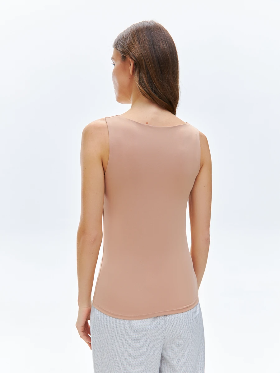 Топ-майка пудрового цвета из эластичной ткани с карэобразным вырезом.
