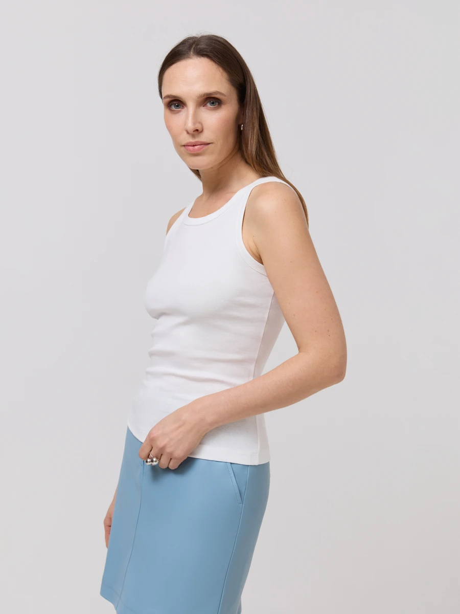 Базовый топ прилегающего силуэта с круглой горловиной. Выполнен из трикотажного полотна.
