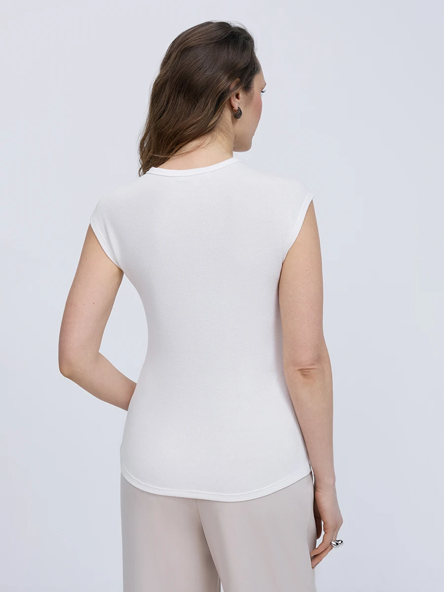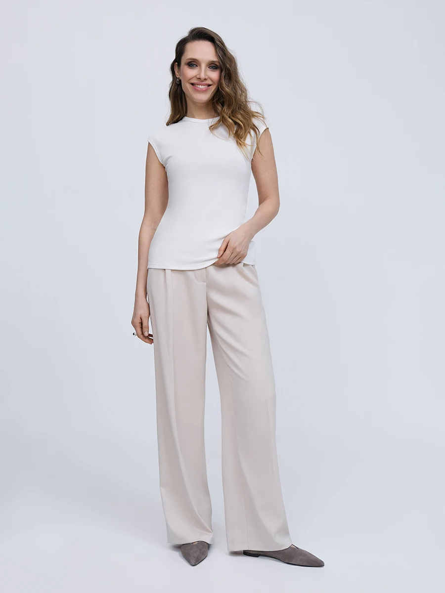 Топ отлично сочетается как с классическими брюками, так и с джинсами или юбками, подчеркивая минимализм и элегантность стиля. Светлый молочный оттенок делает модель особенно подходящей для летнего сезона, а благодаря качественному составу изделие долго сохраняет форму и цвет. Идеальный выбор на каждый день — будь то офис, прогулка или встреча в городе.