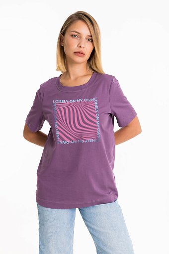 Футболка из однотонной кулирки, 100% хлопок. С коротким втачным рукавом и притачной планкой по горловине. Спереди нанесён принт.