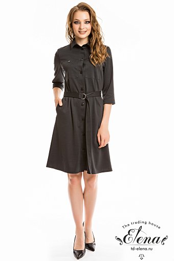 Платье выполнено из однотонного академика. Рукава длиной 3/4 и застёжка на пуговицы по всей длине изделия. Спереди и в боковых швах платья расположены карманы, линия талии подчеркивается поясом.