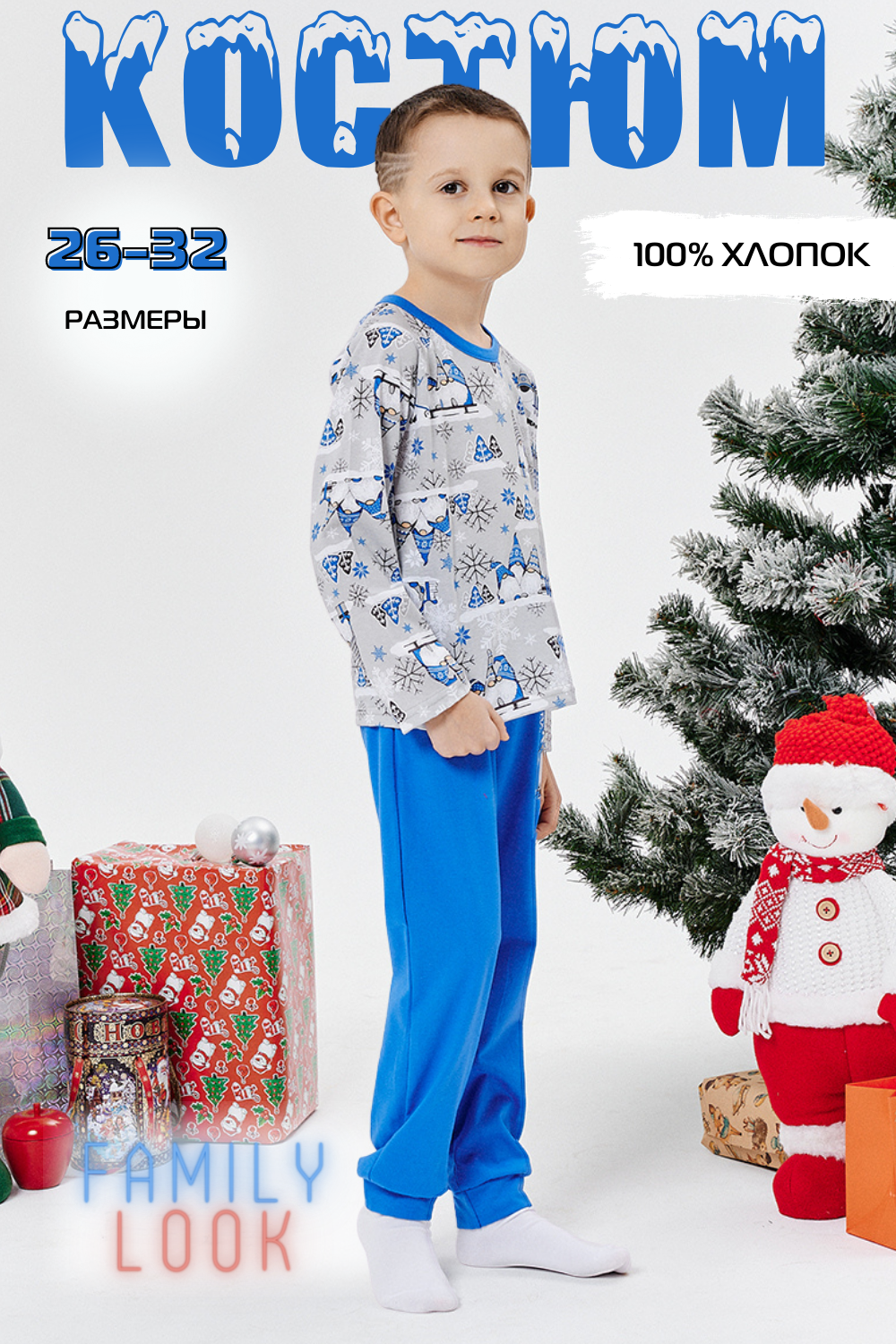 Костюм детский для мальчиков из кулирного полотна состоит из кофты и брюк. Кофта прямая, горловина круглая, обработана окантовкой, рукав длинный, реглан, низ изделия обработан на плоскошовной машине. Брюки прямые, верх на поясе с резинкой, спереди на брюках принт, низ изделия на плоскошовной машине. Данный костюм из серии Family look, к нему можете приобрести женский костюм: 42275, детский костюм для девочек: 42276, мужской костюм: 42274.