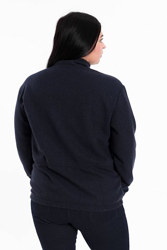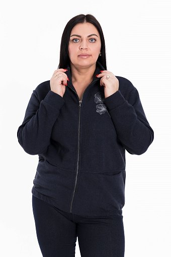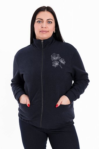 Толстовка выполнена из полотна академик с мерцающим блеском. Спереди с карманами и застёжкой на молнию. Воротник-стойка, рукава на манжетах. С левой стороны расположена вышивка.