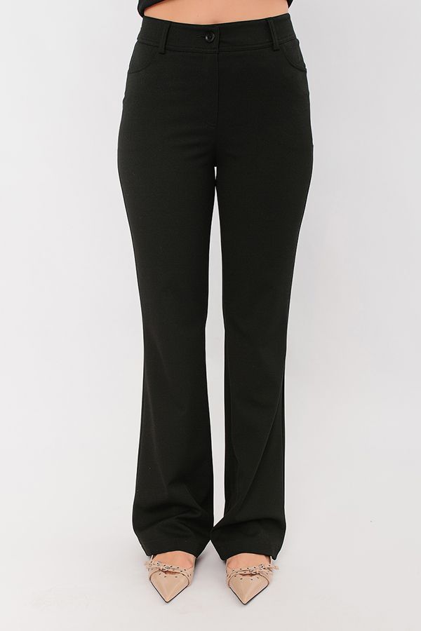 Модель брюк в полную длину, с небольшим клешем от колена.  Детали: спереди застежка на молнию и пуговицу, боковые карманы с горизонтальным входом. Сзади в поясе резина на сборке, шлевки на поясе. Карманы и пояс с декоративной отстрочкой. Длина по внутреннему шву - 84 см. Ширина низа - 25 см. Числовые параметры соответствуют размеру 44. Размер модели на фото: 44. Параметры модели: 83-63-94. Рост модели на фото: 173 см.