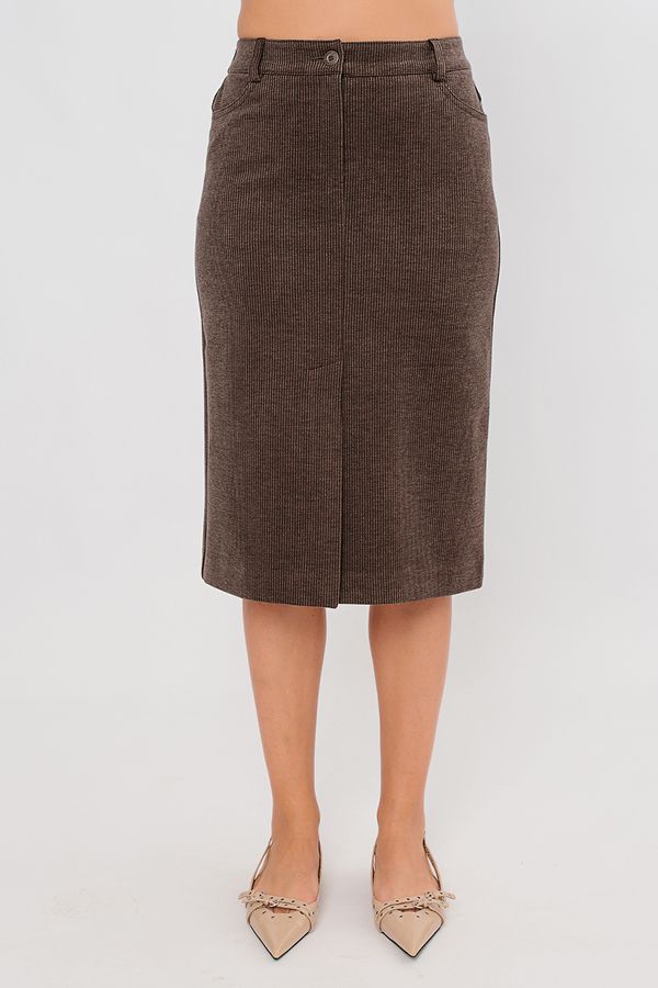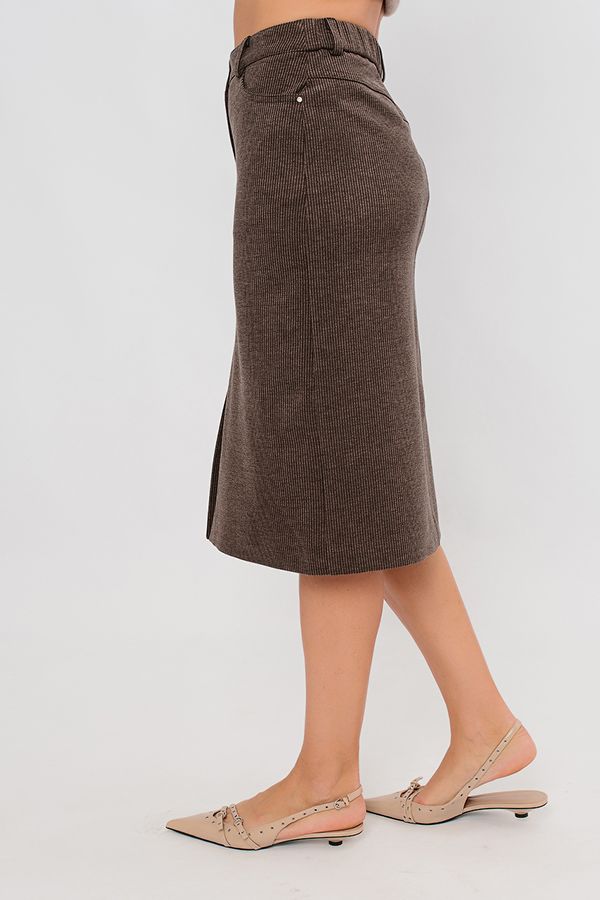 Современная молодежная юбка из трикотажного полотна под "вельвет". Детали: Спереди застежка на молнию и пуговицу, карманы с горизонтальным входом, в среднем шве шлица. Сзади кокетка с двойной отстрочкой. В поясе по спинке резина, на поясе шлевки. Длина изделия 68 см. Размер модели на фото: 44.  Параметры модели: 86-63-94. Рост модели на фото: 173 см.