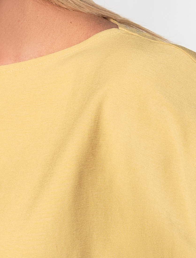 Ассиметричный топ с цельнокроеным рукавом выполнен из плотного лиоцелла. Добавление синтетических волокон в составе изделия предотвращает сминаемость. Модель золотистым логотипом бренда. Подходит для любой фигуры. Для создания расслабленного образа, сочетайте в костюме с брюками D24.214, D24.218, шортами D28.054 и юбкой D26.181