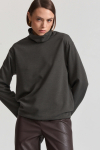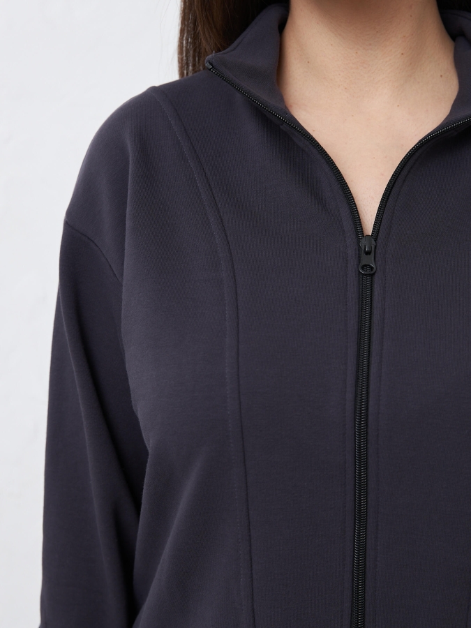 Костюм из футера 3-х нитки с худи на замке и широкими брюками. Худи со спущенным плечом среднего объема, с застежкой на молнии и воротником - стойкой.