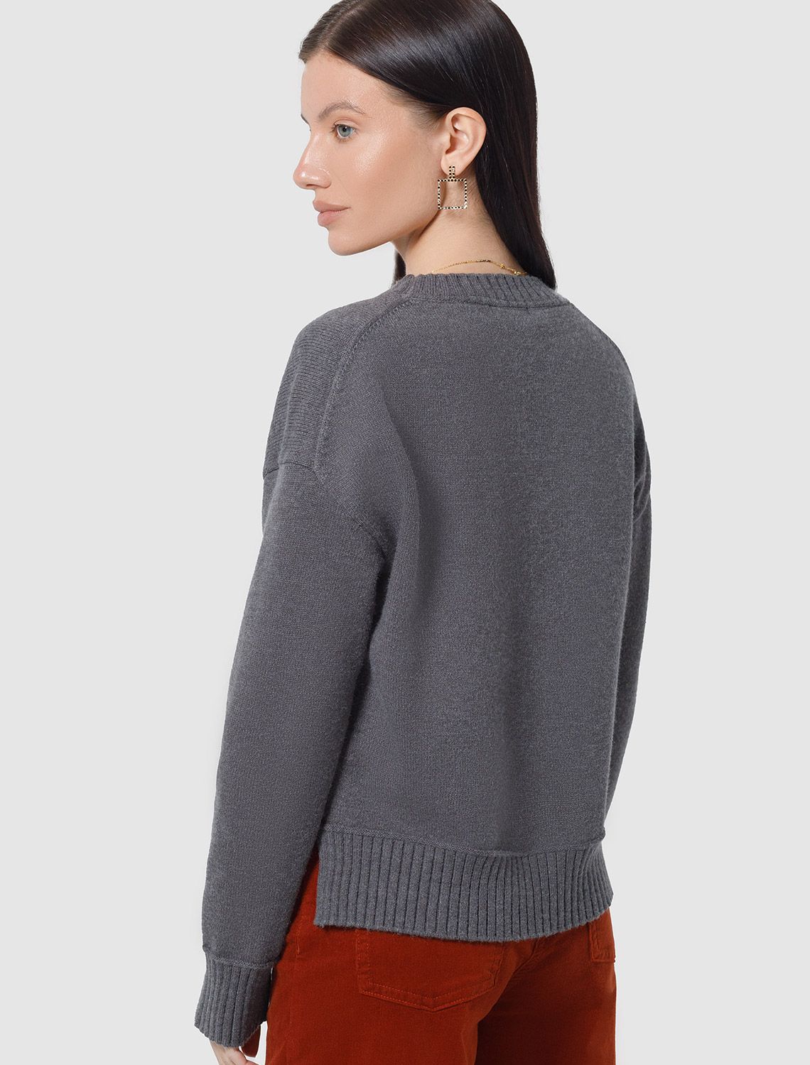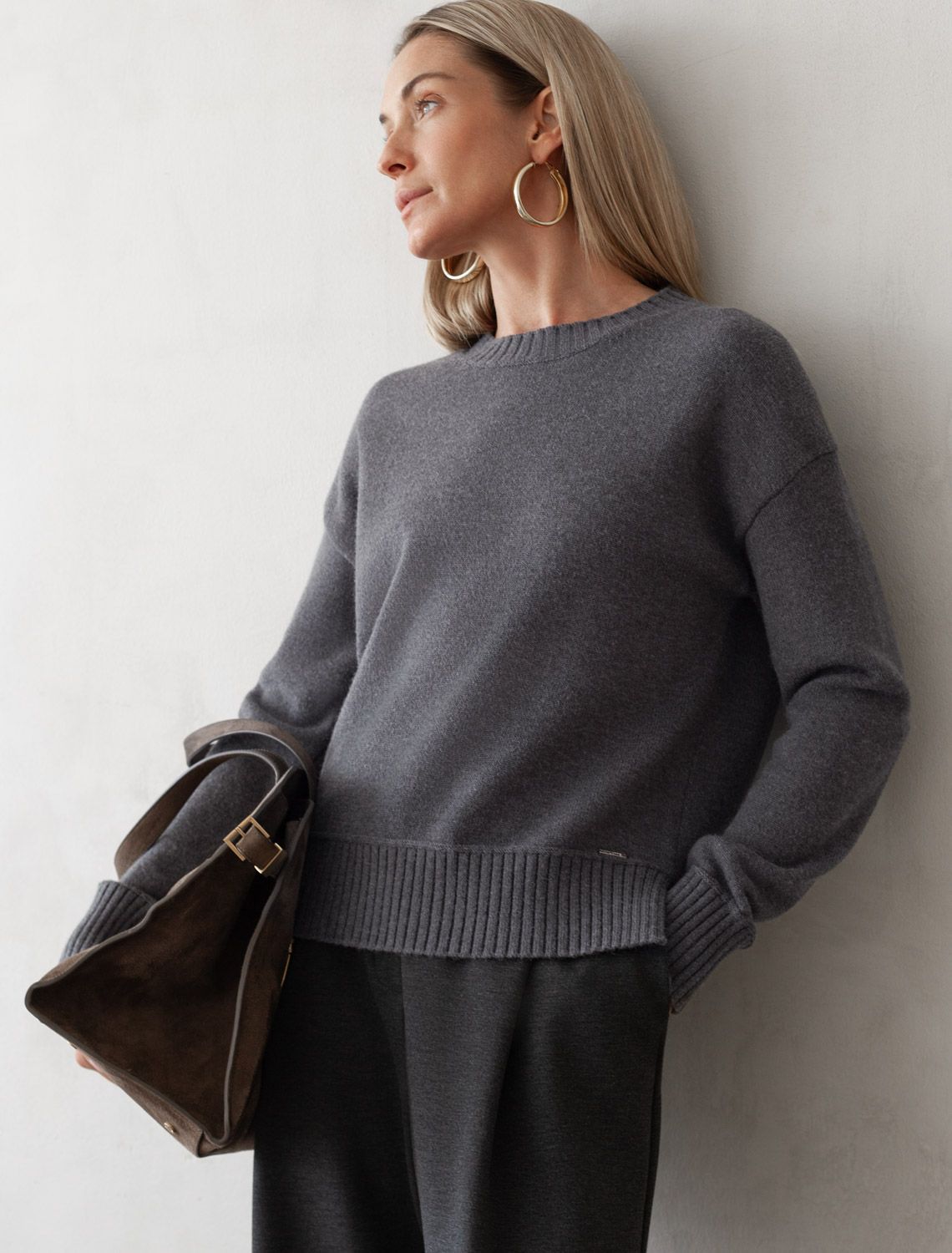 Укороченный джемпер темно-серого цвета с круглым вырезом связан из высококачественной пряжи с кашемиром — идеальное сочетание мягкости и практичности. Пряжа с кашемиром придаёт ему бархатистую нежность и тонкую структуру, каждое прикосновение с которой, напоминает о тепле и уюте в прохладные дни. Благодаря нежной текстуре материала этот вариант отлично подходит даже для чувствительной кожи, не вызывая раздражения и дискомфорта в течение дня. Сдержанный, элегантный силуэт джемпера подчёркивает вкуc обладательницы, а филигранная отделка ворота — внимание к деталям. Универсальный оттенок и изящная мягкость делают его идеальным выбором в любой ситуации Широкие манжеты и нижний край добавляют аккуратности, а продуманная посадка и небольшие разрезы по бокам делают повседневный джемпер удобным для многослойных образов — от офисного комплекта до расслабленного уикенда. Свободный крой джемпера идеально подходит для женщин, которые ценят удобство и стиль одновременно, а так же идеальноподходит на большие размеры. Благодаря качественной пряже свитер сохраняет форму и внешний вид даже после многократных носок.