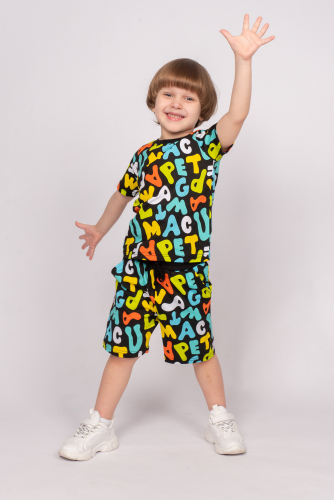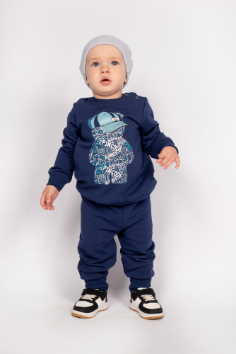 Комплект детский, состоящий из джемпера и брюк. Джемпер детский прямого силуэта с втачным длинным рукавом. Горловина круглая, обработана воротником из кашкорсе. Горловина спинки внутри обработана бейкой из кулирки. На левом плече застежка на 2 пробивные кнопки. 1 кнопка на воротнике, 1 по центру плеча. Рукав заканчивается манжетом из кашкорсе. По низу изделия пояс из кашкорсе. На полочке принт шелкография. Надпись переводится как Плюшевый мишка. Брюки детские прямого силуэта. Пояс цельнокроенный, с эластичной тесьмой внутри. По низу изделия манжеты из кашкорсе.