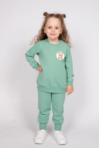 Комплект для девочки, состоящий из джемпера и брюк. Толстовка прямого силуэта со спущенным длинным рукавом. Горловина круглая с капюшоном. Капюшон состоит из 2 половин, в цвет изделия. Горловина спинки внутри обработана бейкой из кулирки. Рукав заканчивается цельнокроенным манжетом с резинкой внутри. На полочке принт шелкография. Надпись переводится как Привет; Давай веселиться; Мои друзья. Брюки прямого силуэта. Пояс отрезной, выполнен из основного полотна, в цвет изделия, с эластичной тесьмой внутри. На изделии выполнены карманы с отрезным бочком и отлетной мешковиной. По низу изделия цельнокроенные манжеты с эластичной тесьмой внутри.