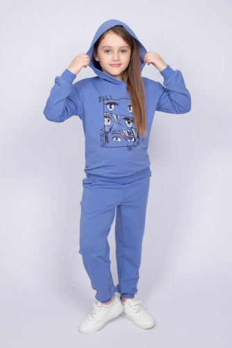 Комплект для девочки, состоящий из джемпера и брюк. Толстовка прямого силуэта со спущенным длинным рукавом. Горловина круглая, обработана воротником из кашкорсе. Рукав заканчивается манжетом из кашкорсе. По низу изделия пояс из кашкорсе. На полочке принт шелкография. Надпись переводится как Любовь. Брюки прямого силуэта. На изделии выполнены карманы с отрезным бочком и отлетной мешковиной. По низу изделия манжеты из кашкорсе.
