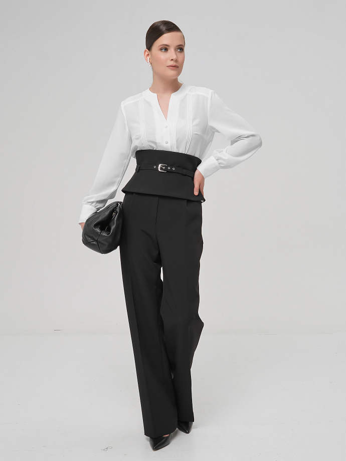 Модель прямого силуэта, с кокетками. По переду и спинке застрочены группы складок. Спереди V-образный вырез и  застёжка на петли и пуговицы. Воротник стойка. По низу рукава разрез, сборка и нанжета с застёжкой на пуговицы. В боковых швах разрезы. Низ блузки закруглён.