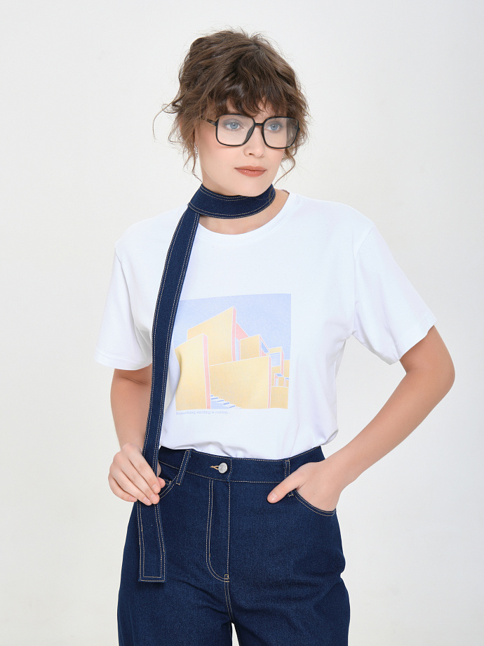 Модель прямого силуэта, со спущенным плечом. Горловина обработана бейкой.