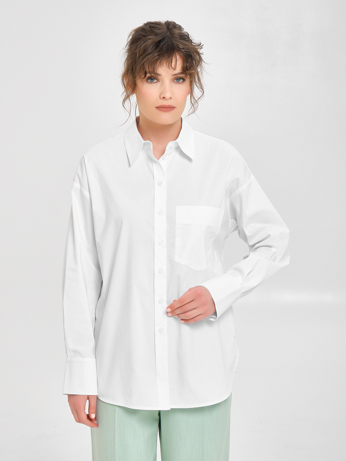 Модель со спущеным плечом. Спереди накладной карман и цельнокроеная планка с застёжкой на петли и пуговицы. Спинка с кокеткой, под кокеткой складка. Низ блузки закруглён. Воротник сорочечный. По низу рукава защипы, планка и манжета с застёжкой на пуговицы. Блузка декорирована отделочными строчками.