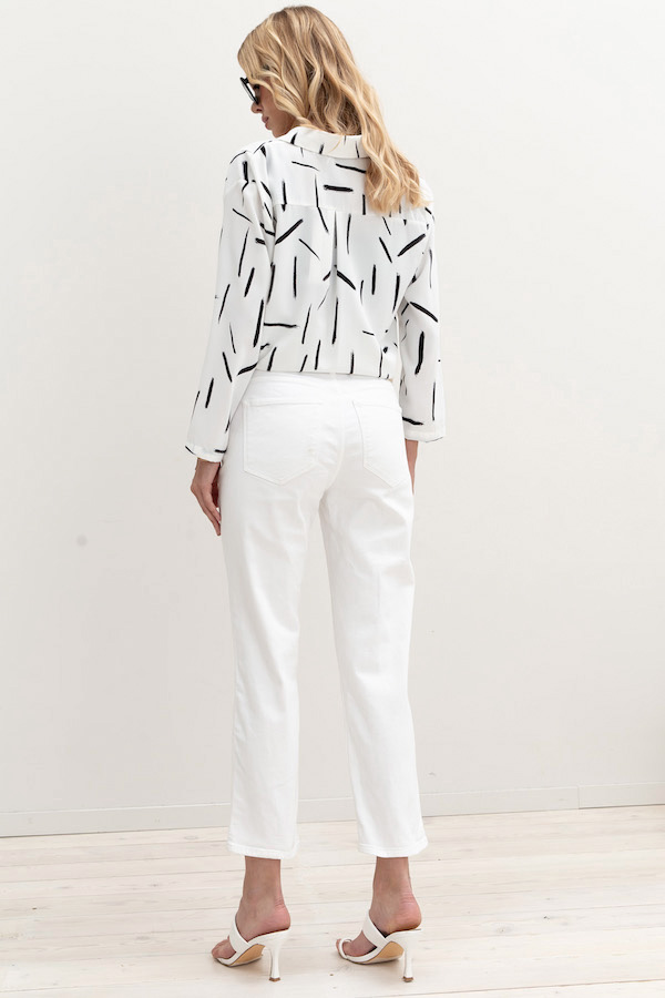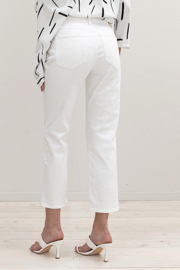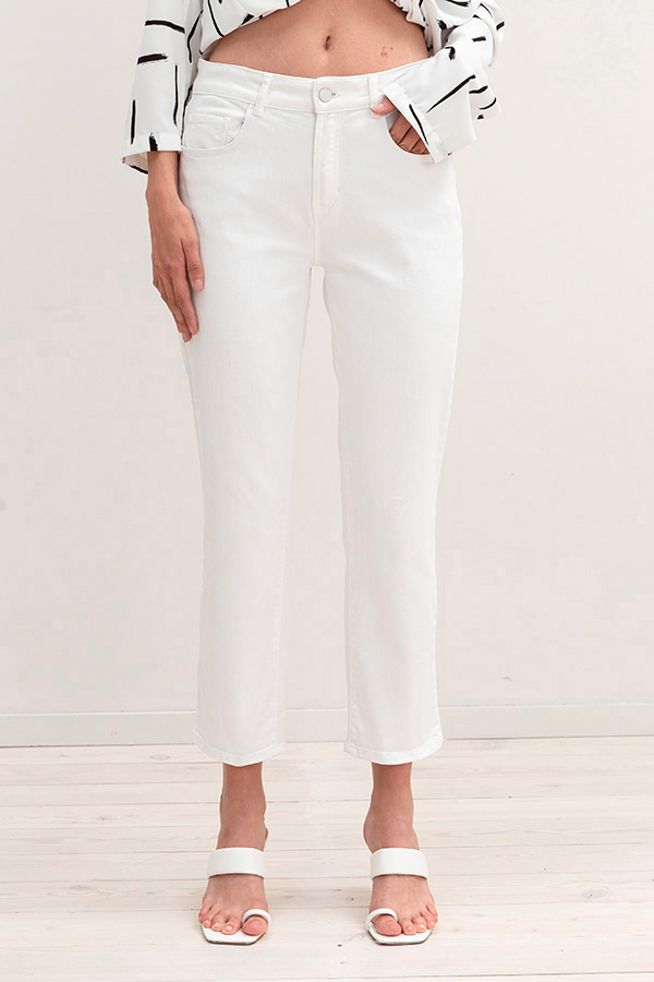 Брюки из эластичного денима, чуть зауженные книзу. На задней части брюк выполнены накладные карманы, на передней - карманы с подкройным бочком. Притачной пояс со шлёвками. Застёжка на молнию-гульфик и пуговицу.