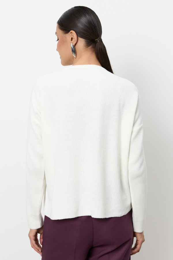 Джемпер свободного силуэта с декоративным вырезом в области плеча. Рукав втачной в спущенную пройму. Изделие выполнено из мягкой структурированной пряжи.