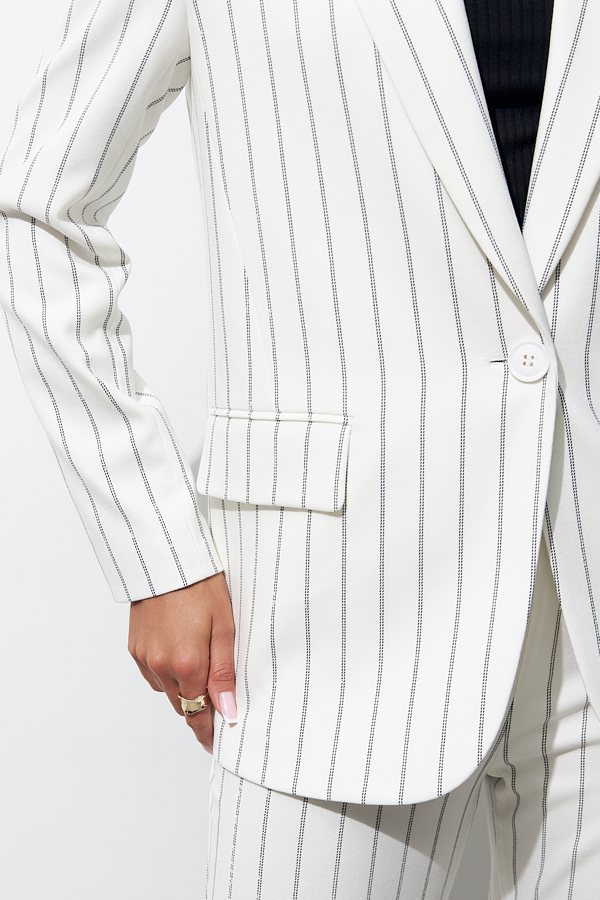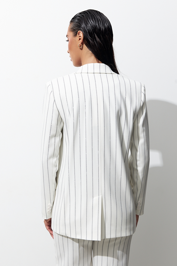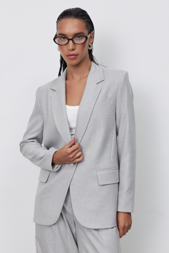 Жакет полуприлегающего силуэта из костюмной ткани. Изделие с английским воротником и застежкой на пуговицу. На передней части жакета выполнен нагрудный карман с листочкой и карманы в рамку с клапаном. По центру задней части выполнена шлица - элемент декоративный и необходимый. Обеспечивает свободу движения, добавляет шику и элегантности. Втачной длинный рукав, снизу имитация шлицы с пуговицами. Изделие идеально держит форму, имеет четкую линию плеча благодаря плечевым накладкам. Жакет на подкладке.
