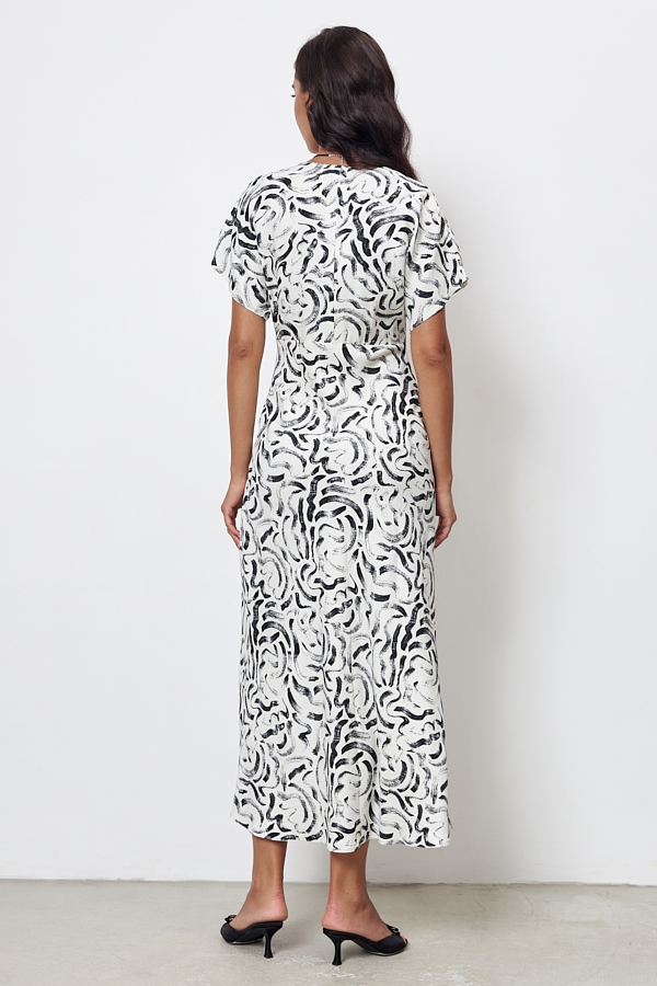 Платье полуприлегающего силуэта из вискозной ткани. Изделие отрезное по линии талии на спинке и чуть выше талии на полочке. V-образный глубокий вырез. Спереди по центру кулиска, в которую продеты два вытачных шнура-завязки. Затянутые завязки образуют драпировку. Короткий цельнокроеный рукав. Юбка скроена по косой. Застежка в левом боковом шве на потайную молнию.