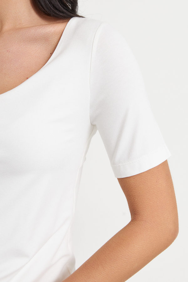 Двухслойный джемпер полуприлегающего силуэта из вискозного эластичного полотна. Втачной короткий рукав, круглый вырез горловины. Благодаря двухслойности переда и спинки изделие скрывает мелкие недочёты фигуры и делает силуэт более ровным. Актуальный джемпер придаст совершено особое звучание и строгим классическим брюкам, и нарядной юбке и даже спортивному костюму. Его легко применять для создания разных образов.