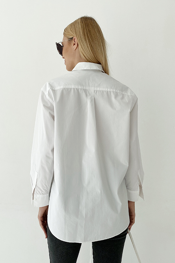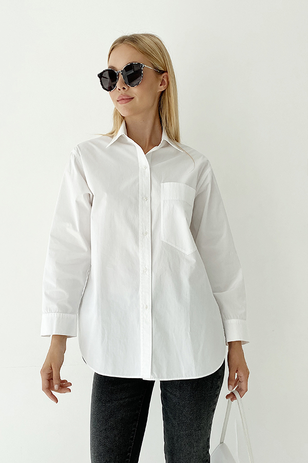 Рубашка из хлопковой ткани свободного силуэта с застёжкой на планке. Низ изделия с закруглениями по бокам и разрезами. Рубашечный рукав на манжете с застёжкой на пуговицы. Вырез горловины обработан отложным воротником на стойке. На задней части изделия выполнена кокетка с небольшой складкой. На передней части - накладной карман в области груди. Достоинство этой модели - в способности скрыть некоторые недостатки фигуры. Её можно сочетать как с брюками, так и с джинсами.