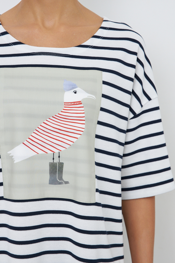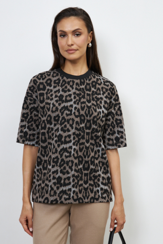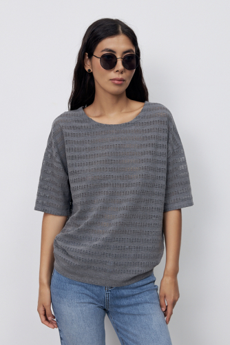 Джемпер свободного силуэта со спущенной линией плеча и рукавом до локтя выполнен из эластичного полотна. Круглый вырез горловины. На передней части изделия выполнена аппликация. В таблице размеров представлены параметры человека, а не изделия.