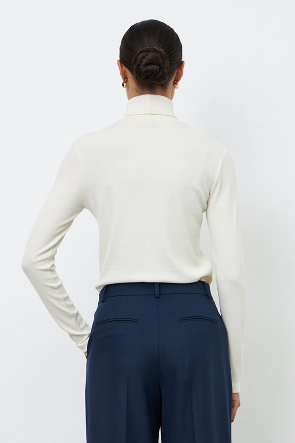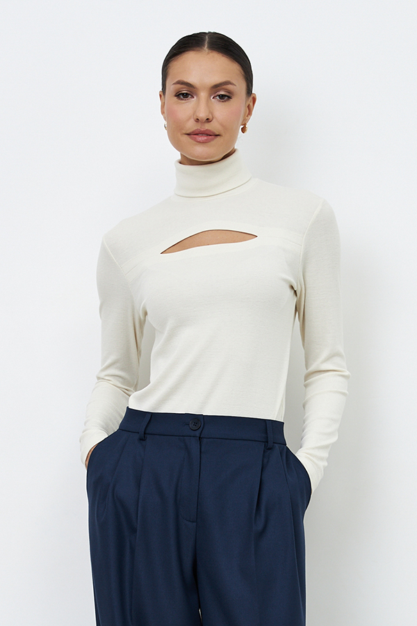 Джемпер из эластичного полотна в мелкий рубчик прилегающего силуэта. На передней части изделия выполнен эффектный разрез. Втачной длинный рукав. Вырез горловины оформлен высокой стойкой.
