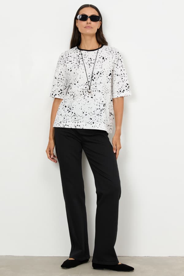 Джемпер из эластичного полотна. Свободный силуэт со спущенной линией плеча и коротким рукавом. Вырез горловины окантован эластичной бейкой. В таблице размеров представлены параметры человека, а не изделия.