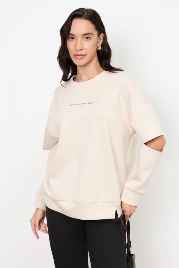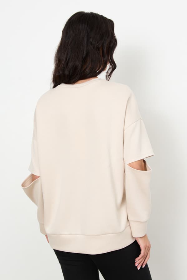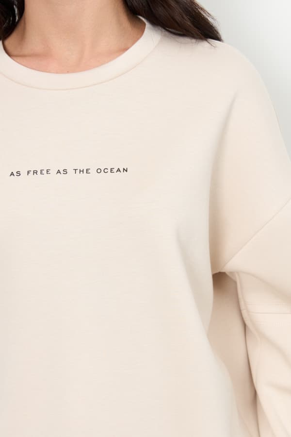 Джемпер из эластичного полотна свободного силуэта. Втачной длинный рукав оригинального кроя со спущенной линией плеча. Круглый вырез горловины оформлен бейкой. По низу изделия и рукавов выполнены притачной пояс и манжеты из основной ткани. В таблице размеров представлены параметры человека, а не изделия.