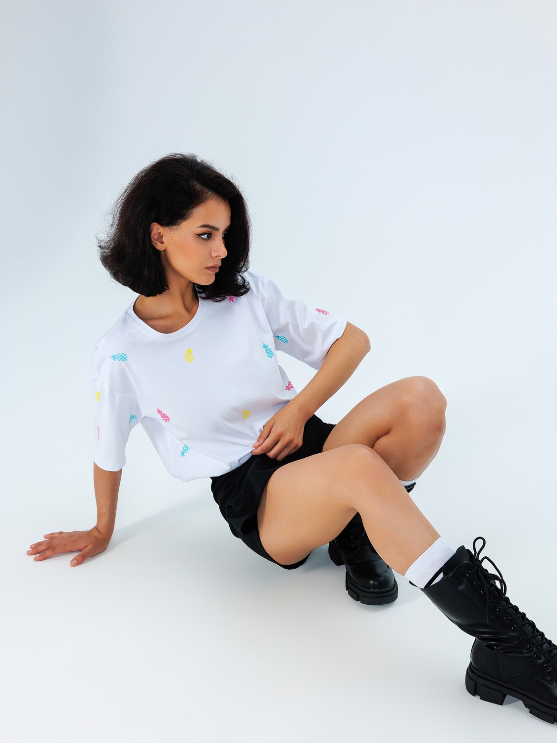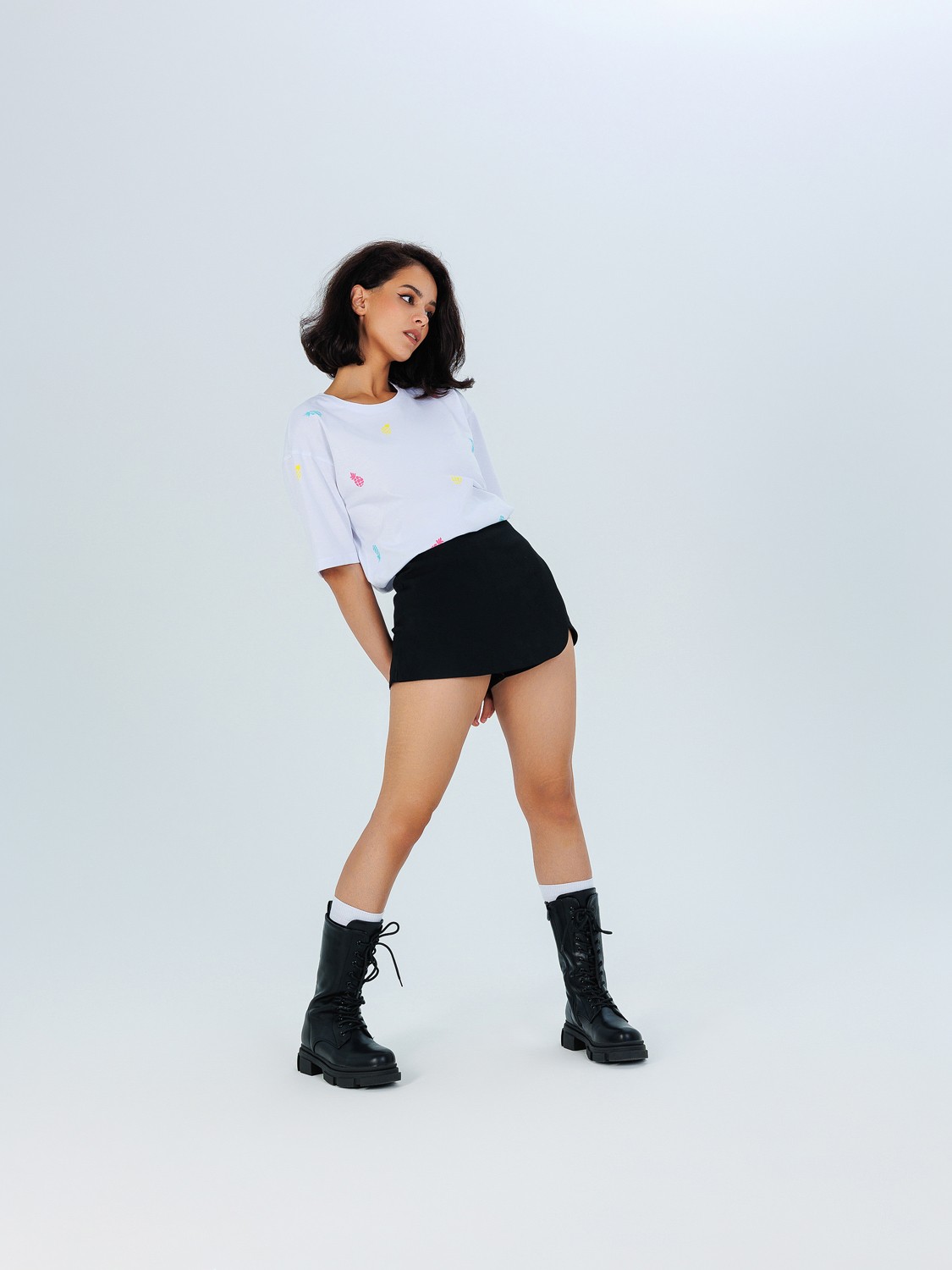 Футболка – свободного покроя, со спущенной линией плеч, втачными короткими рукавами, горловиной овальной формы, обработанной притачной планкой и принтом на полочке, выполненным в технике «шелкографии».