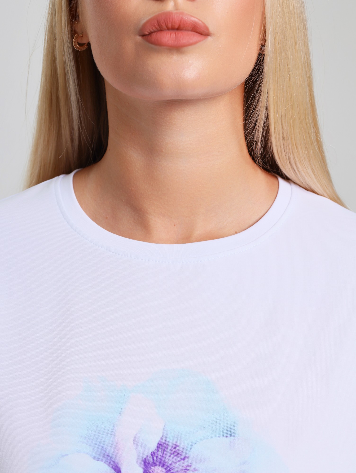 Футболка женская из гладкокрашеного трикотажного полотна «кулирка с лайкрой», классического покроя, с втачными короткими рукавами и печатью на полочке, выполненной в технике «шелкографии». Горловина овальной формы обработана втачной планкой с отделочной строчкой по шву притачивания.