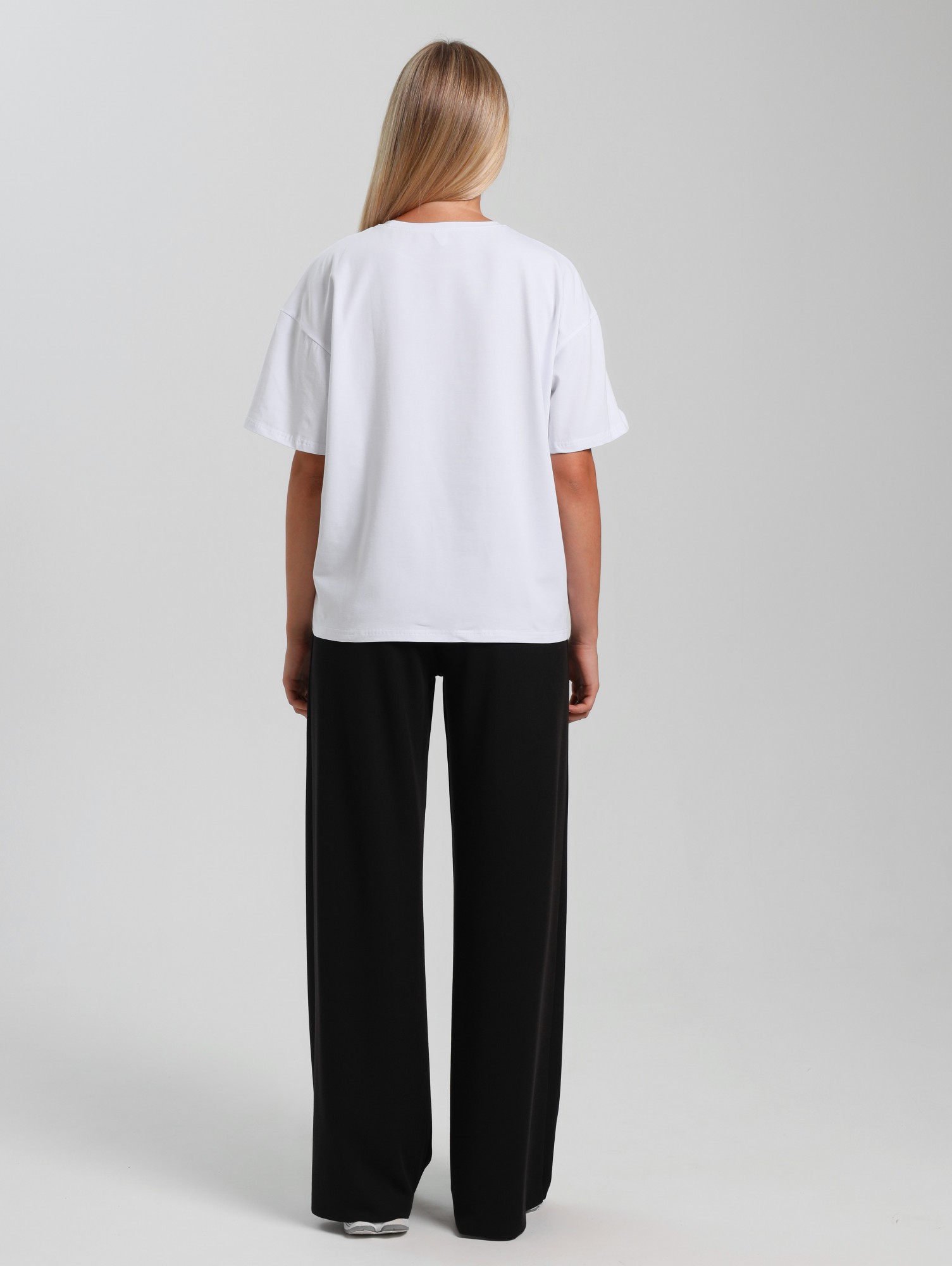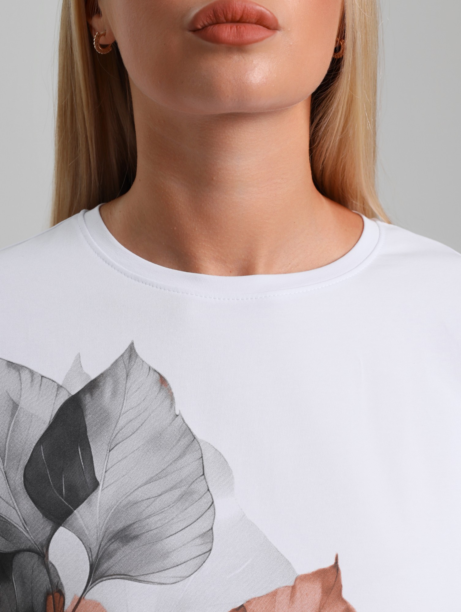 Футболка женская из гладкокрашеного трикотажного полотна «кулирка с лайкрой», классического покроя, с втачными короткими рукавами и печатью на полочке, выполненной в технике «шелкографии». Горловина овальной формы обработана втачной планкой с отделочной строчкой по шву притачивания.